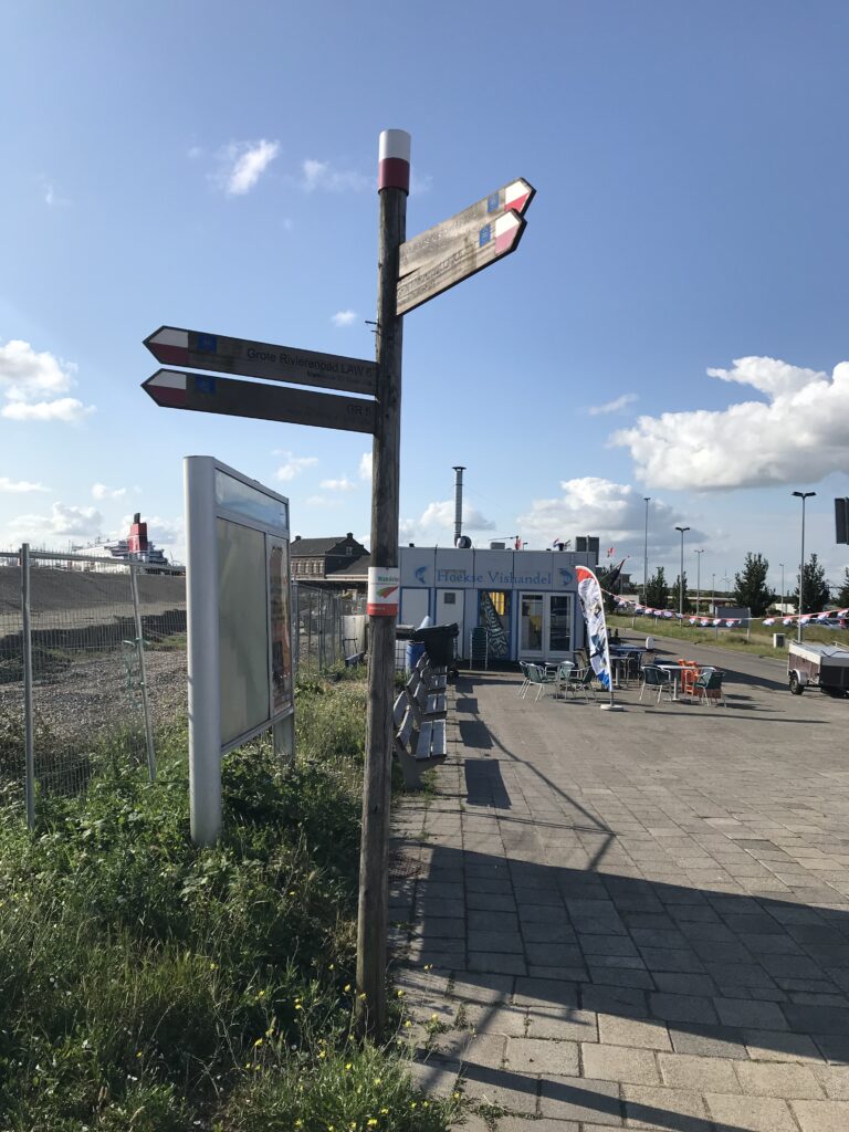 We zetten onze auto neer bij station Maassluis. In 2019 was de metrolijn naar Hoek van Holland al wel aangelegd, maar door tegenslag met het veiligheidssysteem nog niet in gebruik genomen. We moeten dus met de bus naar het startpunt in Hoek van Holland. Daar uitgestapt zoeken we het startpunt van onze dagroute op, de wandelpaal bij het haventje van het dorp (daar komt ook de veerboot uit Harwich aan en gaat de E2/GR5 route vanuit Engeland verder).