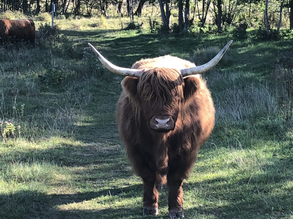 Vrijwel direct lopen we het natuurgebied Waterbos in en vinden gelijk een kleine kudde Schotse hooglanders op ons weg. Met hun enorme hoorns zijn ze heel indrukwekkend en ze staan op het pad waar we overheen moeten. We weten dat ze in principe niet gevaarlijk zijn, maar met best wel wat aarzeling en licht verhoogde hartslag lopen we langs deze grote beesten. Behalve een geïnteresseerde blik van hun kant gebeurt er niets.