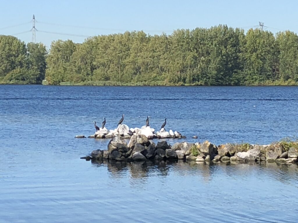 We lopen onder de provinciale weg door en komen bij het Brielse Meer uit. We wandelen door bossen en langs kleine strandjes met regelmatig uitzicht op het water waar dit weekend natuurlijk veel pleziervaart is. Wat aalscholvers doen zich rustend op wat rotsen in het water tegoed aan de zon.