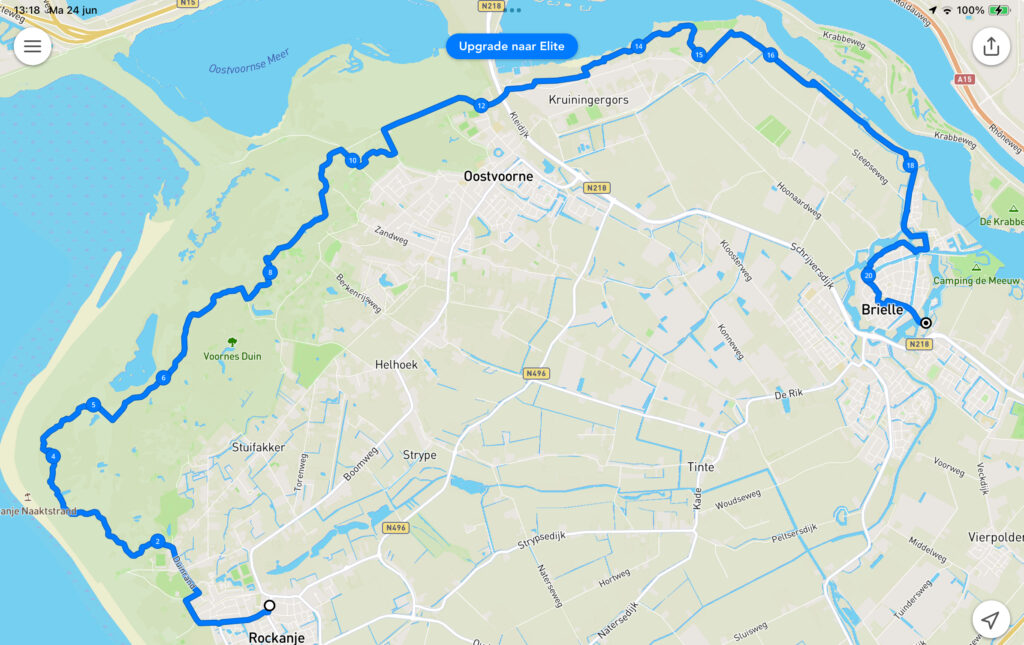We hebben deze etappe ‘andersom’ gelopen en zijn begonnen in Rockanje bij punt 10 in de wandelgids en gelopen tot aan Brielle, punt 6 in de wandelgids. Totale afstand is 21 kilometer.