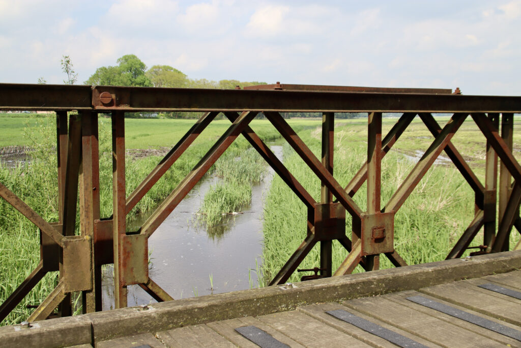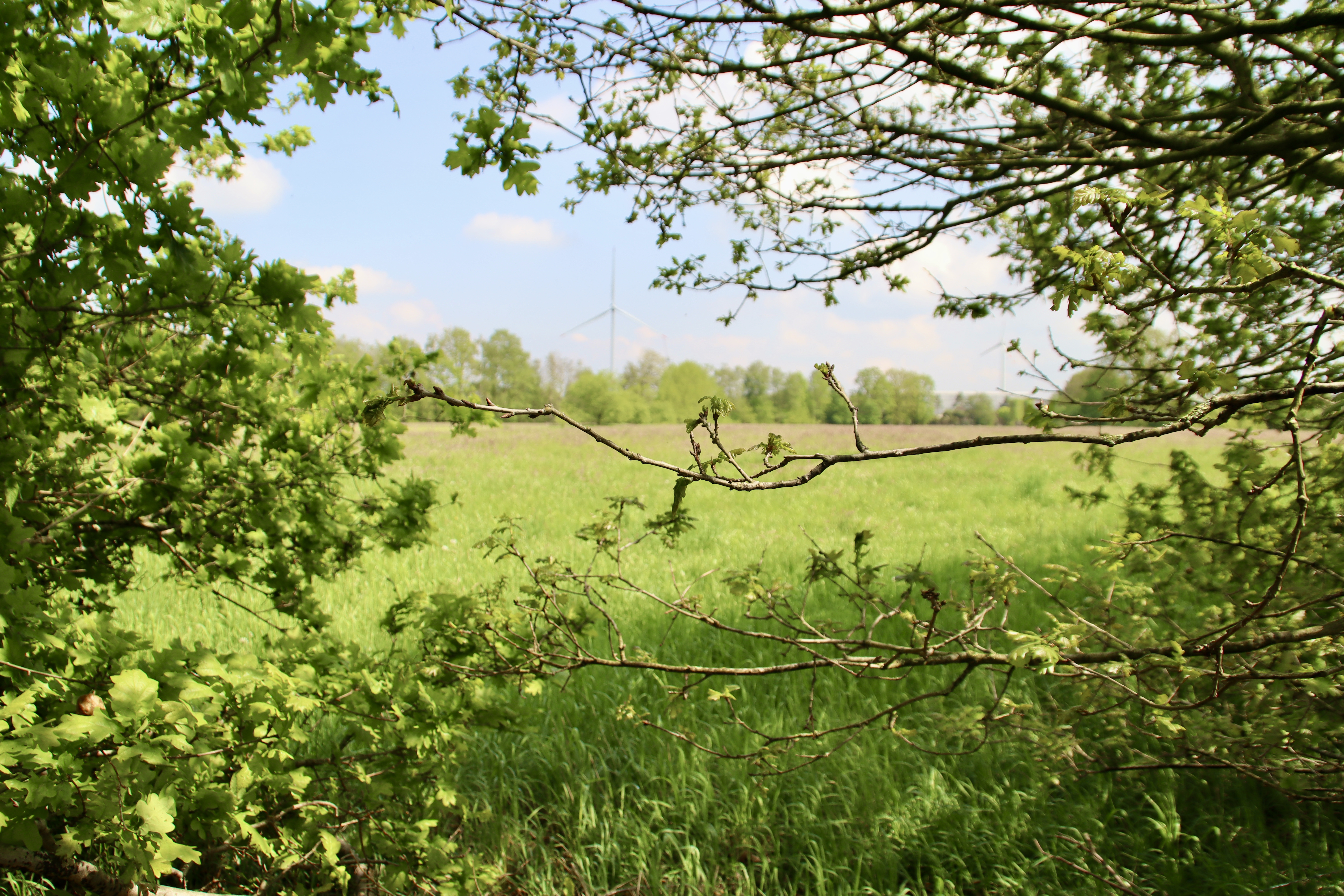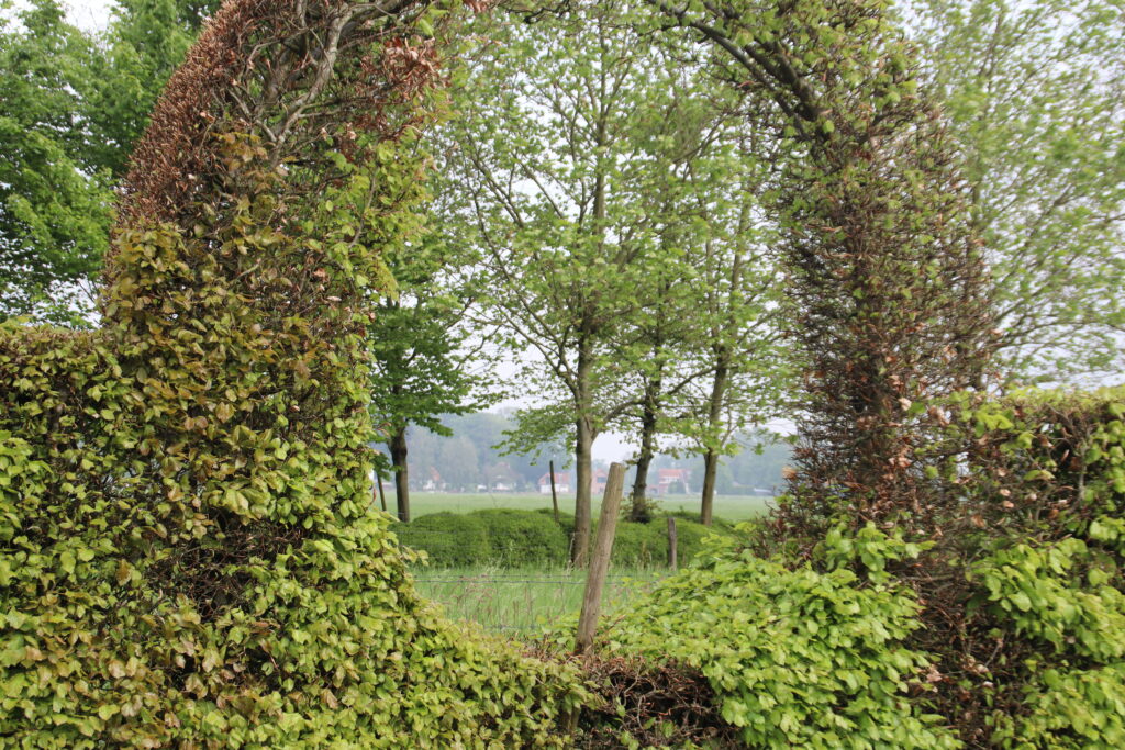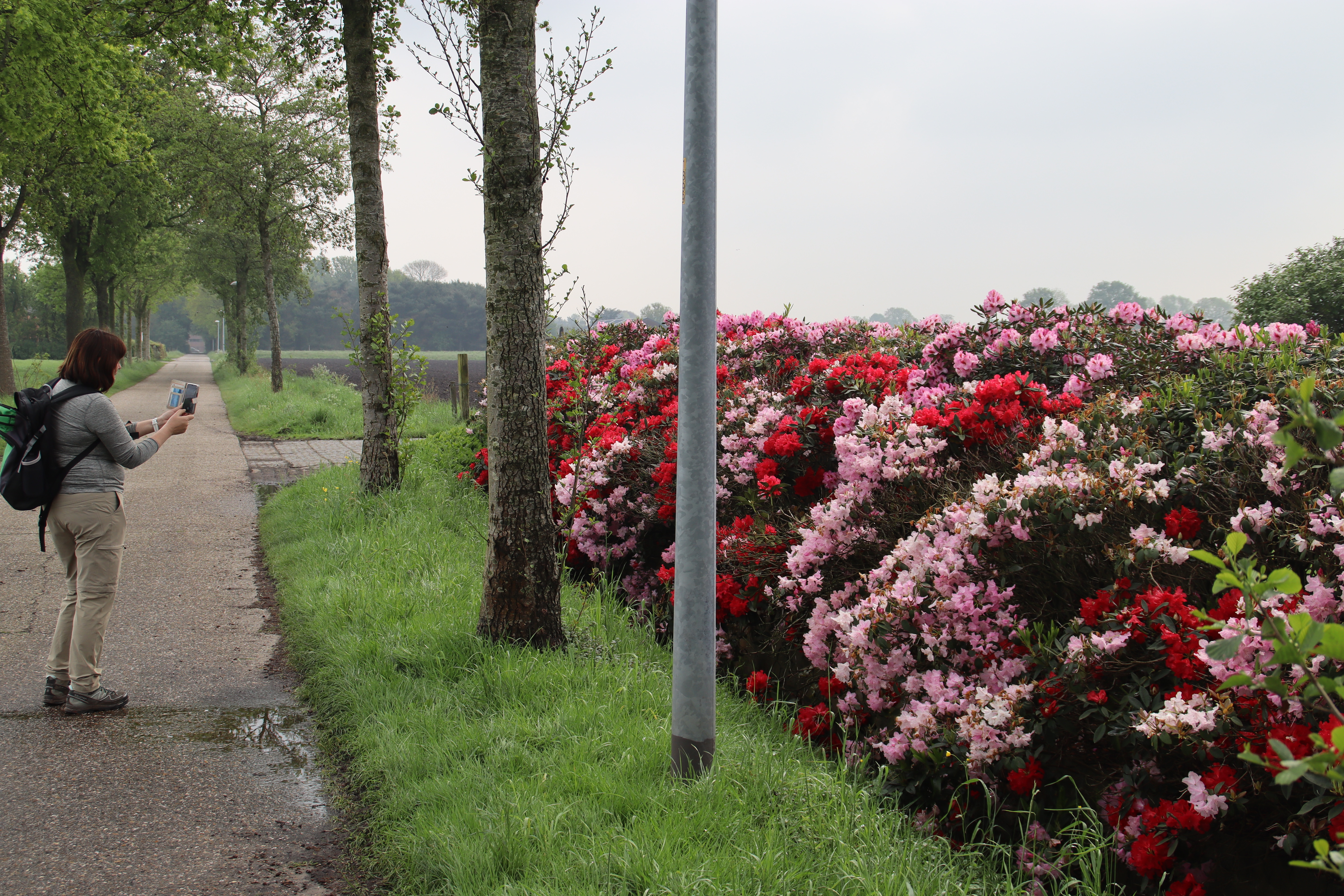 We lopen over veelal verharde wegen langs boerderijen en landerijen voorbij het gehucht Achterbroek in de richting van Wuustwezel. De rhododendrons langs de weg staan prachtig in bloei. Dat het veel regent de laatste maanden is goed te zien. Veel plassen in de wei en de koeien staan soms behoorlijk in de modder in plaats van in het gras. We duiken voor de eerste keer kort een bos in, het Pastoorsbos, en vrijwel direct spotten we een bankje, een goede gelegenheid voor een korte pauze. We zijn de appelflappen helemaal vergeten, die hadden we in Kalmthout best kunnen kopen bij een bakker, want die zijn op zondag hier in België bijna allemaal open. Een boterham dus maar met een paar slokken water, nog een sanitaire stop en we kunnen weer door.