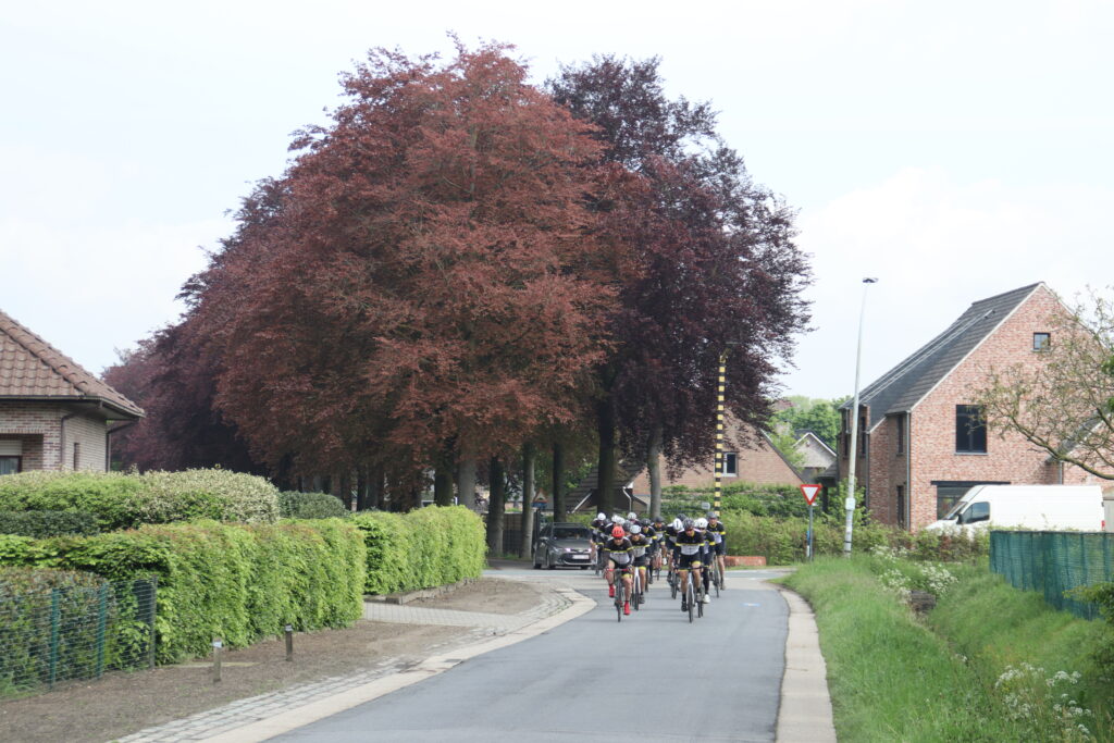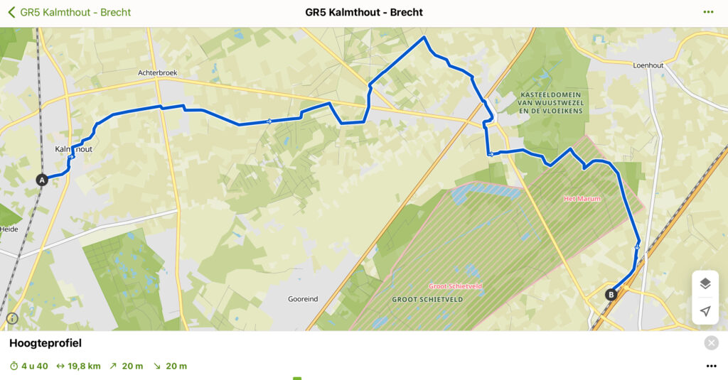 Het GR5 traject loopt direct langs het station Kijkuit, en we haken dan ook gelijk in. We lopen Kalmthout door, waar ze net aan het opbouwen zijn voor een plaatselijke wielerronde. Bijna ieder dorp hier in België heeft geloof ik wel een jaarlijkse wielerronde. Wij kijken graag naar de Belgische voorjaars-klassiekers, maar dan wel thuis op tv. We zijn grote fans van Mathieu van der Poel, maar het wielrennen in het algemeen, mannen en vrouwen, is veel leuker om naar te kijken dan pakweg 10 jaar geleden. Het is nu geen moment saai meer. Dit voorjaar ’24 verloopt het wielerseizoen wel heel bizar, met al die zware valpartijen en veel favorieten in de kreukels.
