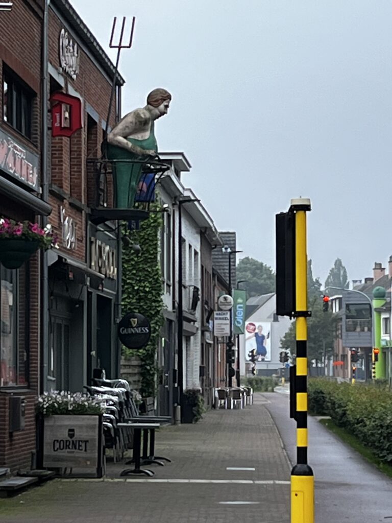 Na de sluizen lopen we via een rustig achteraf paadje richting Olen. We horen nu het gebrul van alle sportwagens, die voor hun ralley rit vertrokken zijn uit Herentals. Is het overlast, of mag iedereen op zijn manier van z’n hobby genieten? In Olen snel een foto gemaakt van de vrouw met stevige buste die uit het balkon hangt boven Irish pub McBoll. We zullen vast niet de eersten zijn die dit doen. We vergeten echter de driepottenfontein op het dorpsplein. En die heeft nog wel zo’n mooi verhaal…..