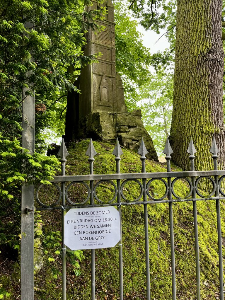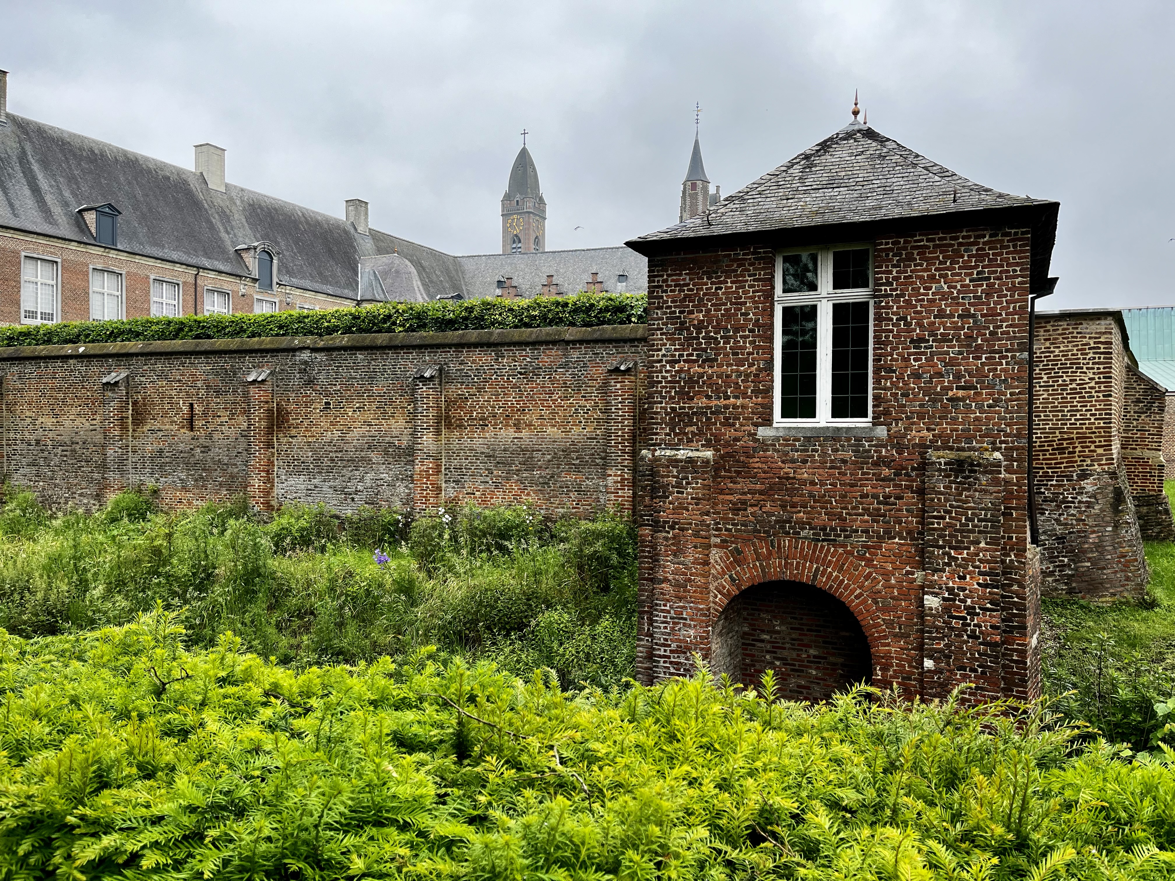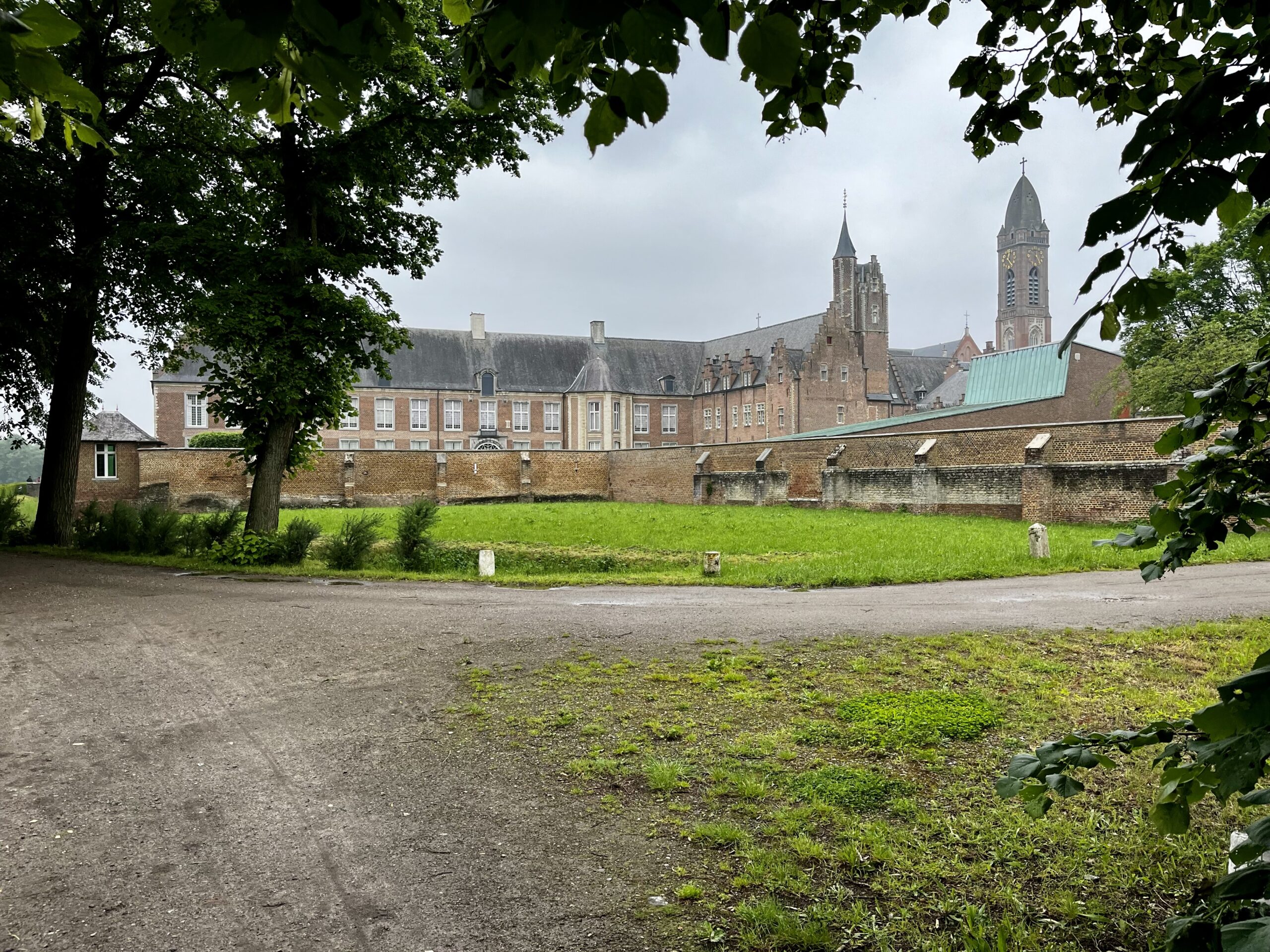Zittend op het bankje had ik op de kaart gezien dat het nog een kleine 5 kilometer lopen was naar de bushalte in Westerlo en rekening houdend met de tijd dat de bus komt, eens per uur, is de inschatting dat we nog tijd genoeg hebben en we stappen dan ook met een relaxed gemoed verder. De Abdij van Tongerlo komt in zicht. Een enorme abdij die uiteraard zijn eigen Lourdesgrot heeft. Dit is zeker niet de eerste grot die we tegenkomen en als ik ChatGPT check blijken er in België naar schatting meer dan 1.500 Lourdesgrotten te zijn. Whow!