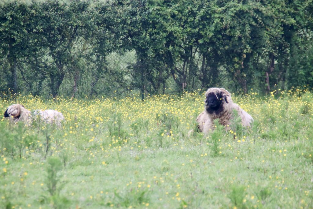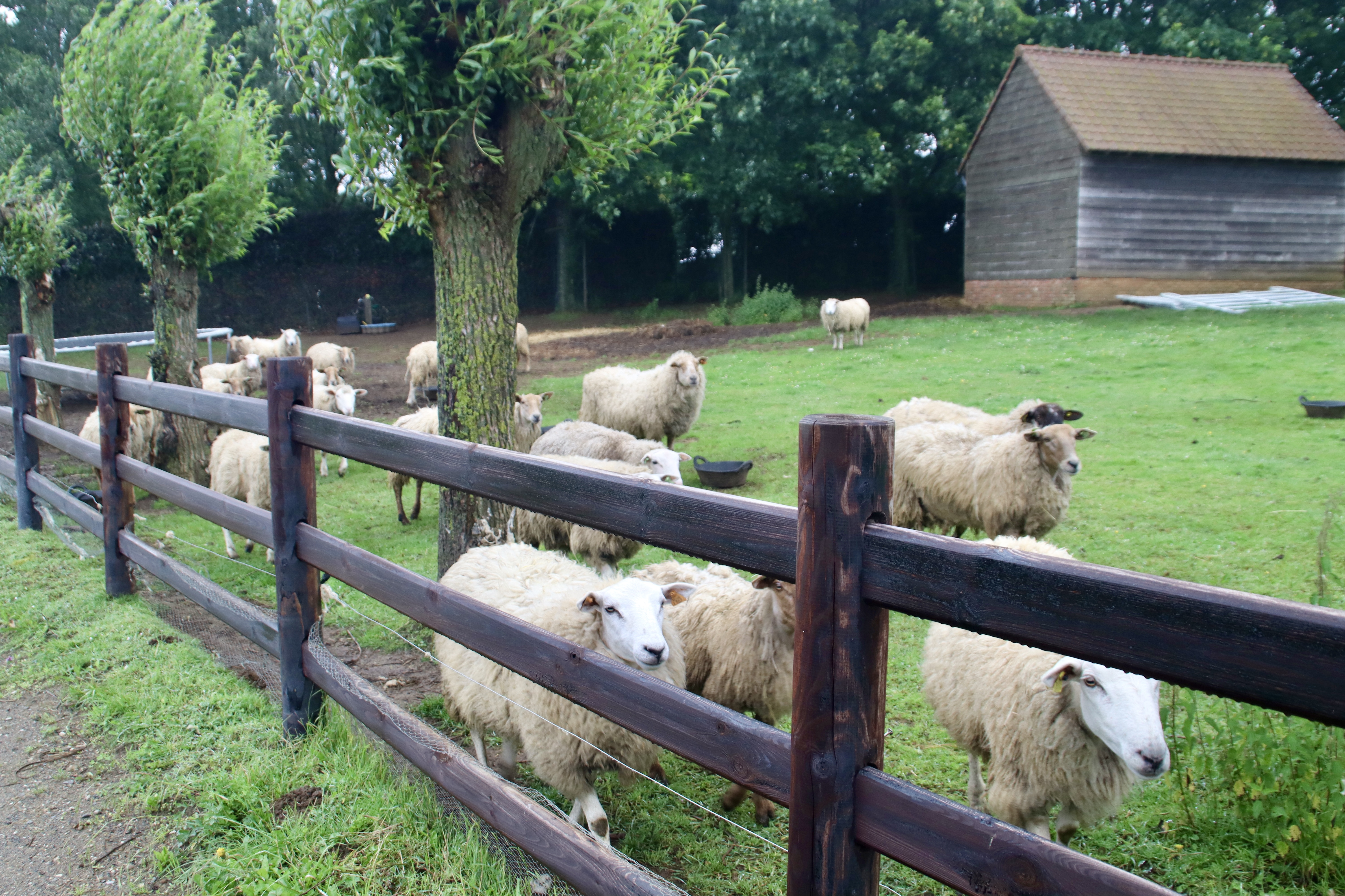 We passeren stroken met veel bloemen, de klaprozen staan er nog steeds goed bij en die doen het altijd goed op de foto’s. Verder weer veel dieren: paarden, kippen, maar ook wat schapen en nog een vrijlopend enorm varken. Die moet nu de tijd van z’n leven hebben met al die modder.