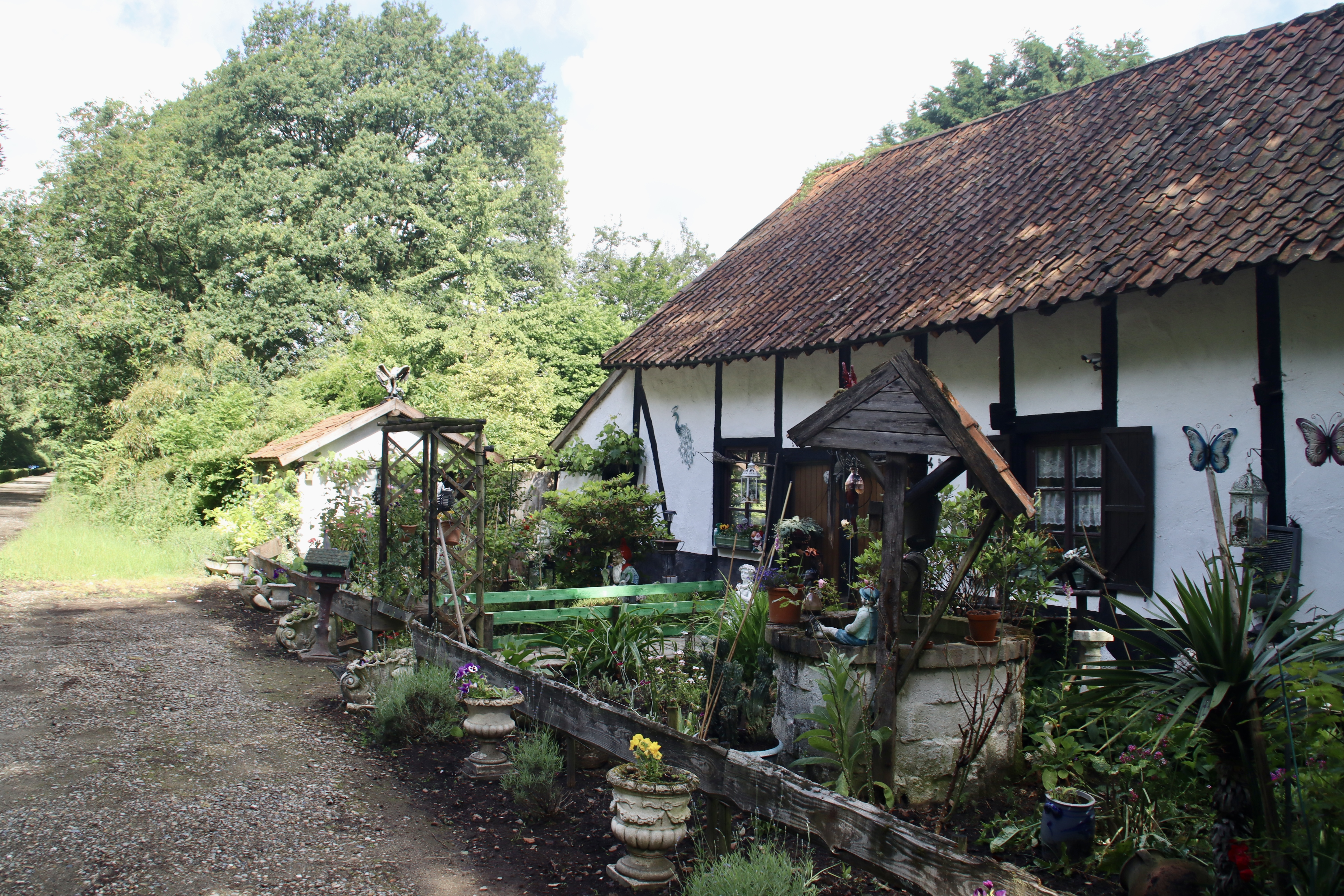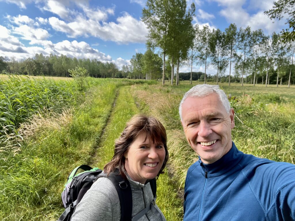We lopen langs een bosrand met bloemenvelden en hier en daar een landelijke woning. Het is hier prachtig wonen. Een vrouw met cocker spaniël komt ons tegemoet en we groeten haar en het beestje even. We groeten nog wat fietsers en hardlopers. Het is zaterdagochtend en lekker weer, dus uiteraard gaat iedereen naar buiten.