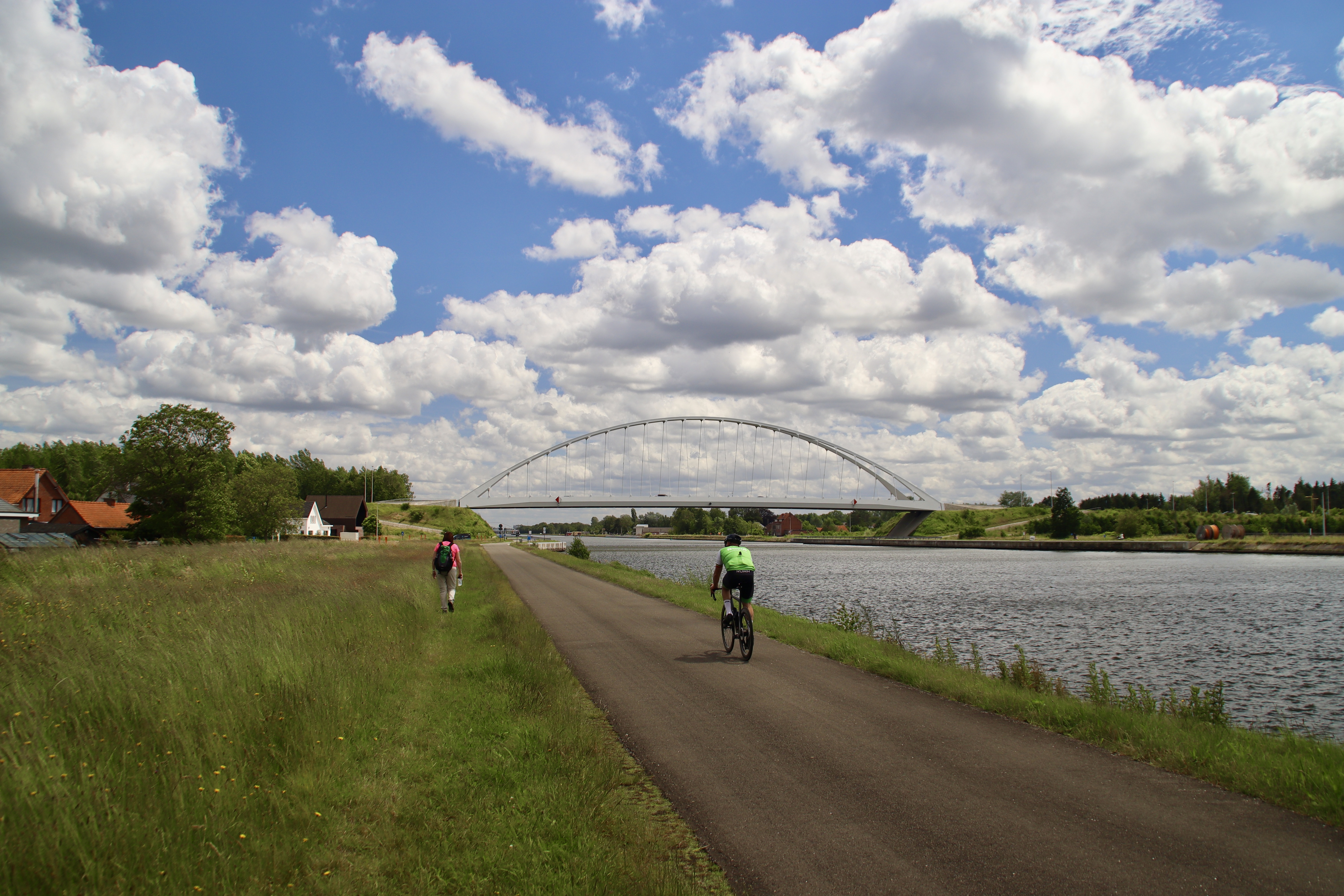 Niet veel verder lopen we de brug over, over het Albertkanaal. Dit kanaal zagen we ook al net voorbij Herentals en we zien in de wandelgids dat we in de komende etappes tot aan Maastricht het kanaal nog vaker gaan zien, want de GR5 route slingert zich tot daar om het kanaal heen. Net voorbij de brug missen we de trap naar benden en volgen we het fietspad. Door deze extra paar meters lopen we langs een prachtige kleurrijke berm met bloeiende bermplanten. Via Google Lens zoeken we de namen op. Naast de gangbare madeliefjes, boterbloemen en paardenbloemen spotten we onder andere de gele dovenetel, bonte wikke, kaasjeskruid en wilde peen.