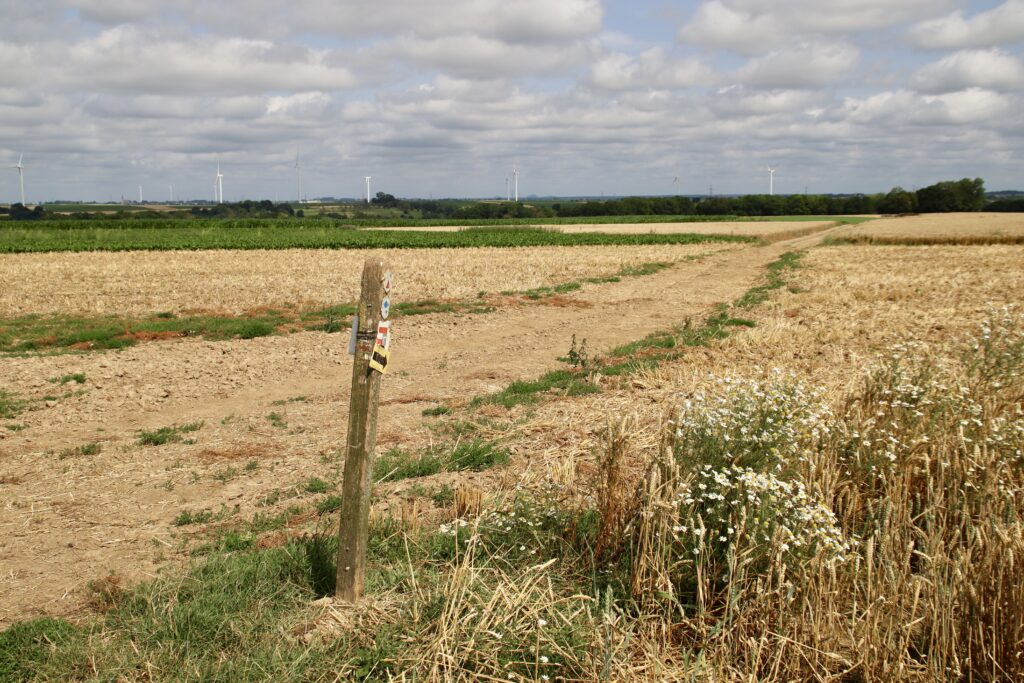 Bovenop de klim lopen we een tijdje over het plateau tussen gewassen die klaar zijn voor oogst: aardappelen, uien, peen en bietjes zien we zoal in de grond zitten. De maïskolven moeten nog even. We hebben inmiddels ruim 16 kilometer afgelegd en bereiken een paar huisjes. Daar blijkt een flinke picknick plaats met WC te zijn. Die komt mooi op tijd voor een sanitaire stop en het vullen van de bidons met kraanwater. In de Maps-me app, waar we de gpx-track van GR5 ingevoerd hebben, kunnen we zien dat we langs een steengroeve lopen, maar krijgen jammer genoeg geen mooi uitzicht op de groeve. We verlaten gelijk daarna het plateau en gaan via een stijler pad naar beneden om in het gehucht Les Manses uit te komen. Naast de wit-rode bordjes zien we hier ook bordjes van een wijnroute waarlangs we blijkbaar lopen. Wijnranken of wijnhuizen kunnen we helaas niet ontdekken. Na dit gehucht gaan we meteen weer omhoog, de derde en laatste klim vandaag. Boven, op het plateau krijgen we eindelijk zicht op ons eindpunt van vandaag, Visé. Verder uitzicht op veel industrie, een snelweg en een drukke spoorlijn. Iedereen die met de auto richting de Ardennen rijdt herkent dit wel: dit zijn altijd de eerste paar zwaar industriële kilometers in België nadat je vanuit Maastricht de grens overgaat die het beeld bepalen.