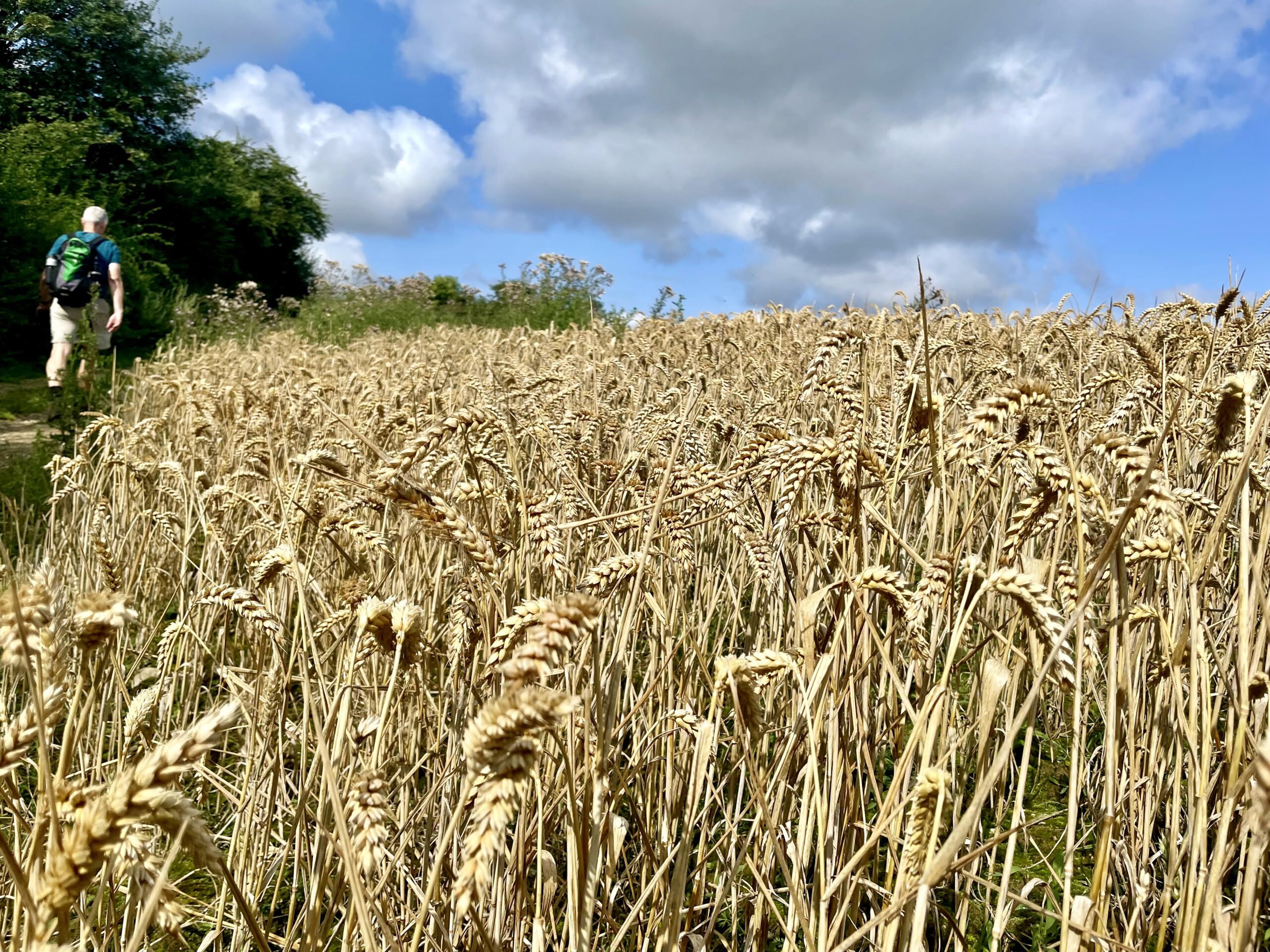We hebben inmiddels 10 kilometer gewandeld en wel zin in een korte stop. Het treft dat we een bankje met schaduw van een boom tegenkomen. Pitstop nummer één. Daarna een stijle afdaling over een pad vol losse stenen naar Wonck. Die grote losse stenen vinden we niet zo heel lekker lopen, dus we zijn voorzichtig. Jammer genoeg gaan we het dorpje Wonck niet in (dus geen bakker) maar lopen er met een grote boog omheen, nog een laatste stukje langs de voortkabbelende Jeker. Wat we zien is niet zo spectaculair, maar gewoon fijn glooiend landelijk landschap. We maken daardoor veel minder foto’s dan gisteren, merken we. Het is wel heerlijk wandelen, met afwisselend zon en wolken en een lekker briesje dat het aangenaam maakt.