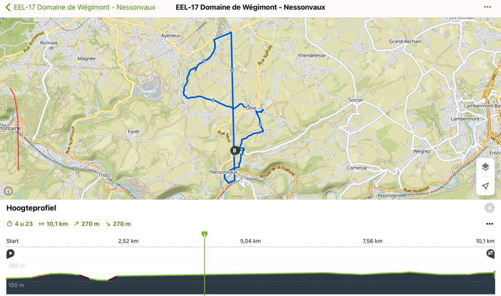 Van Domein van Wégimont naar Nessonvaux. Qua GR5 route 9.5 kilometer plus 0.6 kilometer aanloop naar de route, dus 10.1 kilometer in totaal.