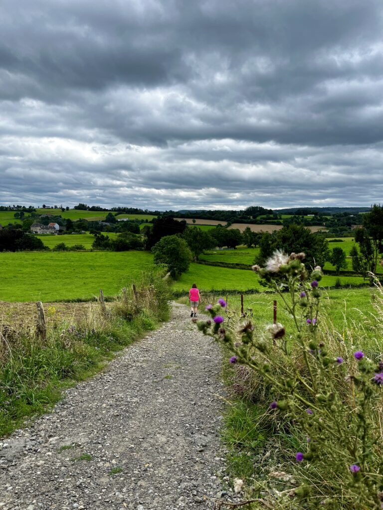 Door de glooiende velden lopen we verder naar het dorpje Olne en dat blijkt een heel pittoresk dorpje te zijn, dus alle tijd voor wat foto’s. Aan de rand van het dorp, tweehonderd meter van de route af, ligt een sportcomplex met horeca en daar kunnen we wat drinken. Tijd voor een cola zero en een sanitaire stop.