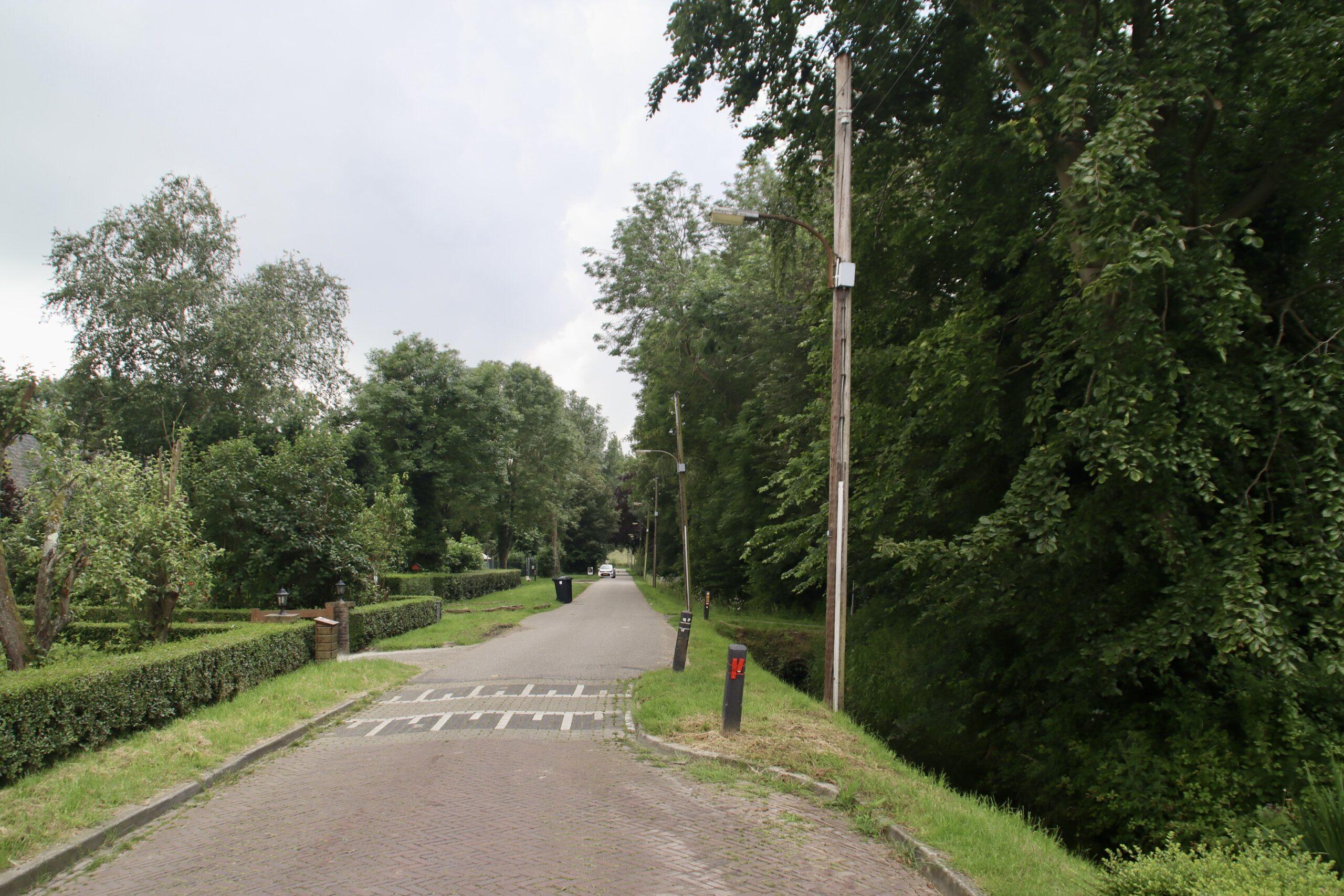 De haven van Maassluis en de veerpont zijn lekker fotogeniek, dus de camera gelijk maar tevoorschijn gehaald. Eenmaal de overzijde van de Nieuwe Waterweg bereikt stappen we Rozenburg in. We hadden ook van deze 2 kilometer van de route geen hoge verwachtingen. Toen we nog volleybalden zijn we allebei vaak in de sporthal in Rozenburg geweest. Het stukje van Rozenburg dat we toen altijd zagen is, laten we zeggen, niet echt inspirerend. Waar we vandaag lopen is het eerlijk gezegd best oké. Na een kort stukje over de dijk duiken we een pad op door een bomenrij langs de rand van het dorp en van daaruit lopen we door een straat van het oude deel van Rozenburg. Dat ziet echt wel leuk uit. Wel verrassend om te zien dat er in die straat nog elektriciteitspalen langs de weg staan. Ze bestaan dus nog in Nederland!