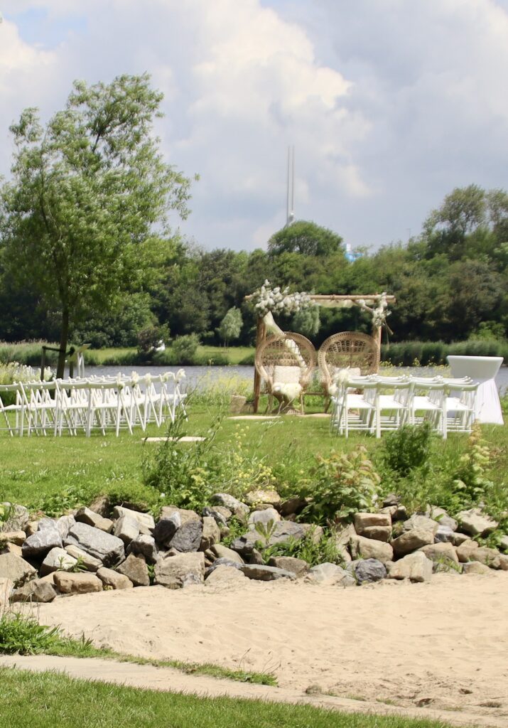 Tot aan Brielle loopt onze route over een recreatief fietspad langs het Brielse Meer. We hebben een fijn uitzicht over het water en op een paar mooie huizen aan de overkant. Je kunt hier prachtig wonen zonder dat je doorhebt dat je aan de rand van de industrie zit. Bij een restaurant is op een klein eilandje een mooie plek gecreëerd voor een huwelijksceremonie. Dat zal later vandaag wel gehouden gaan worden.